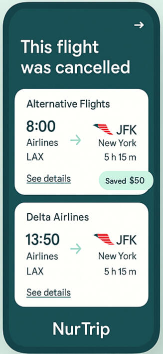 Skip the queue. NurTrip instantly finds rebooking options across airlines, plus nearby hotels and transport — all in one tap.