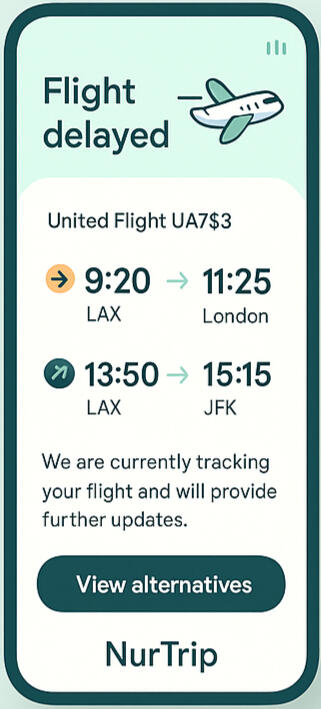 NurTrip detects problems the moment they happen and offers real solutions — alternative flights, accommodation, and compensation assistance — before your airline even updates its website.Our disruption engine detects and solves problems in real time.