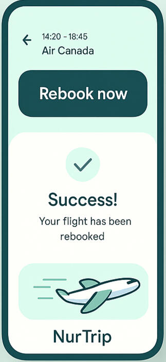 Skip the queue. NurTrip instantly finds rebooking options across airlines, plus nearby hotels and transport — all in one tap.